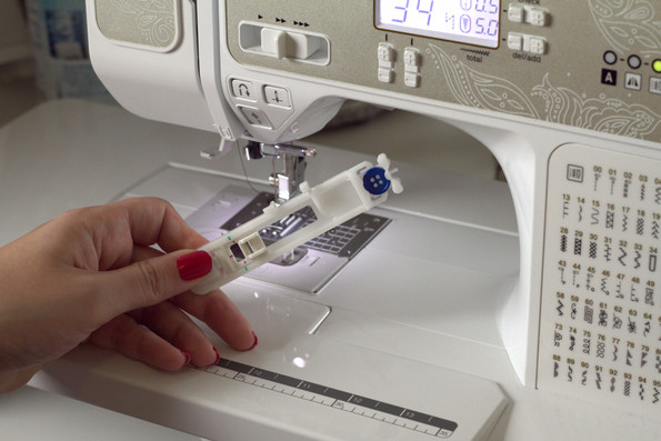 This is your buttonhole foot, yours may look a bit different, but this is fairly standard for most modern day low shank machines. Put your button in the slider as mine is, the slider will guide your machine in making holes the perfect size for your buttons. As for machine settings, on mine you just choose which style hole you want and set it for that. I chose 34, its rectangular with one round edge. Choose whichever hole speaks to you and suits your project – or go standard and choose the basic rectangle.