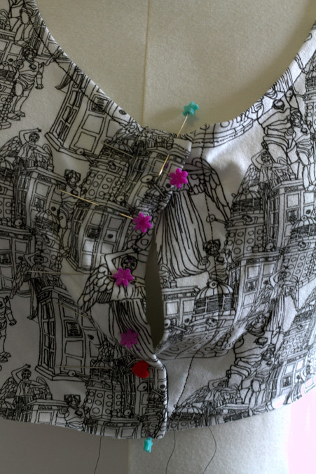 Anyway! Pin your side seams at ½”. Put your bodice on and pin your center fronts together. The placket overlaps one inch, basically just lay the two plackets over each other. Pin top and bottom.